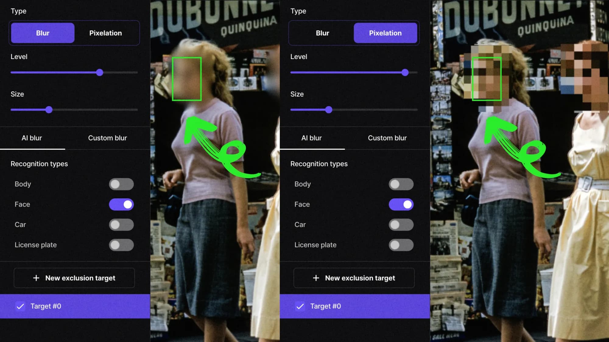 - โ Toggle blur on/off after processing โ Click any face in the preview to unblur it if AI incorrectly detected a statue or poster as a person, then re-export without re-uploading