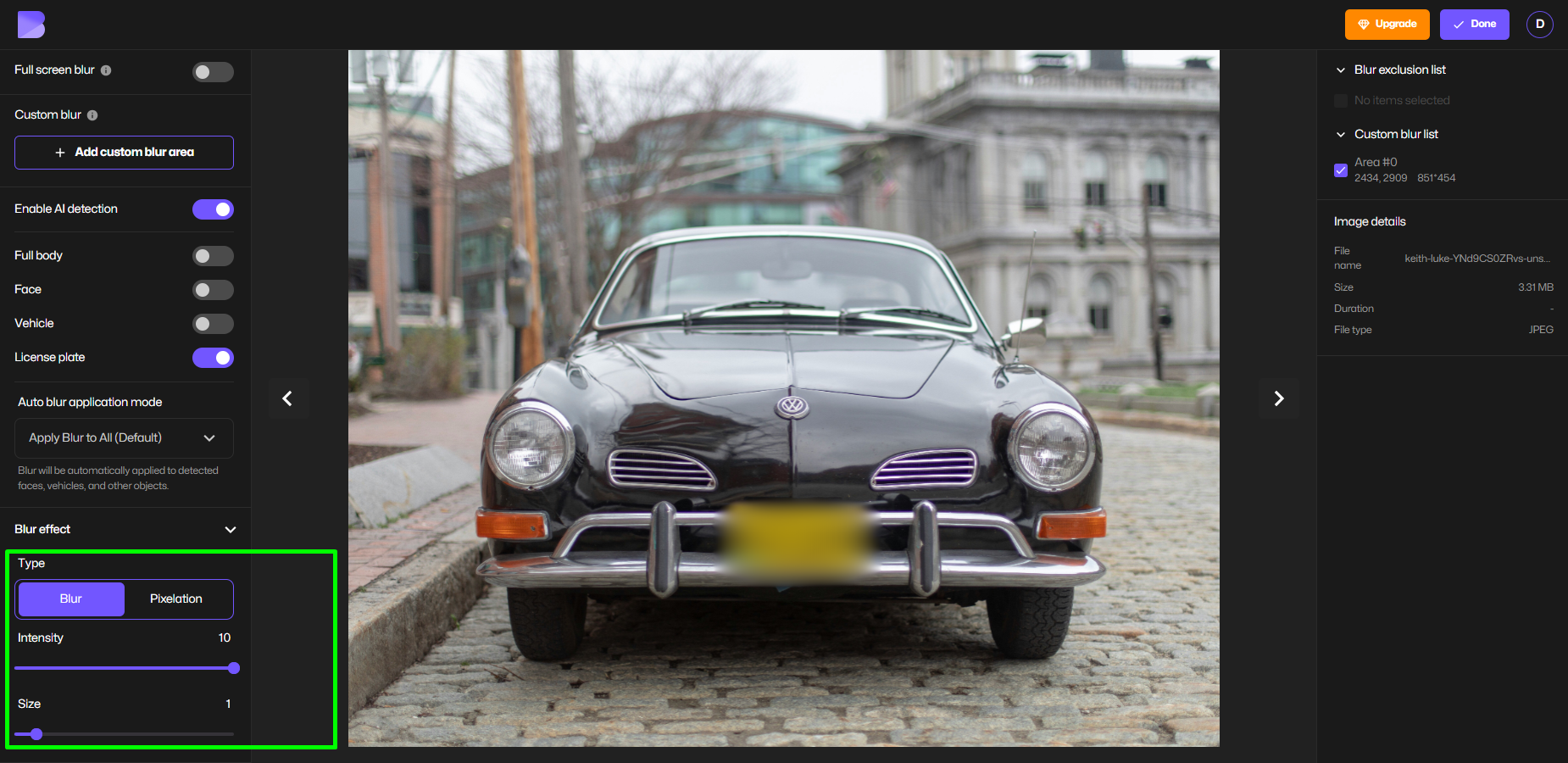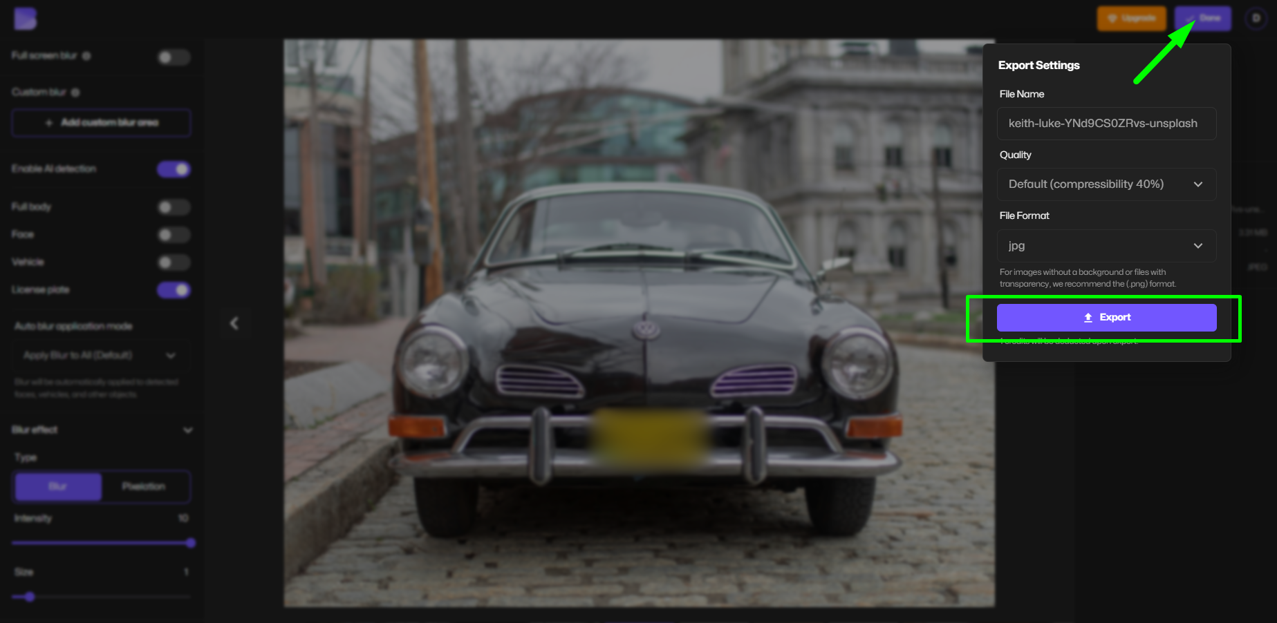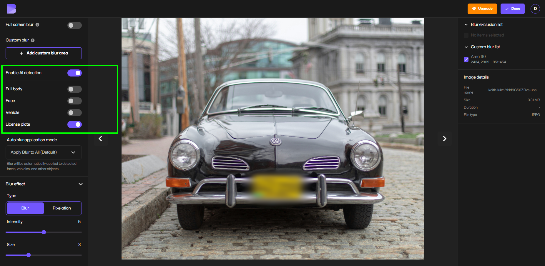 Pro Tip: The AI Detection feature is perfect for photos with multiple cars or complex backgrounds, saving time while ensuring every license plate is securely blurred.