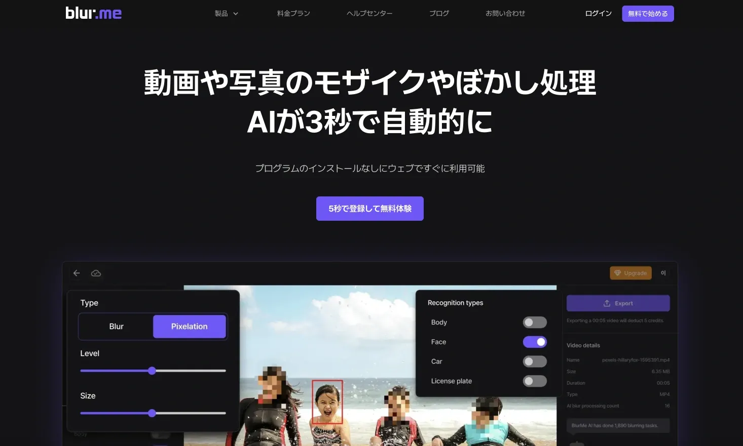 Blur.meは、AIによる自動顔検出とナンバープレート認識を搭載したWebベースのぼかしツールです。アプリのインストールは不要 — ブラウザで開いて写真をアップロードするだけで、3秒以内に顔を自動検出してぼかし処理が完了します。