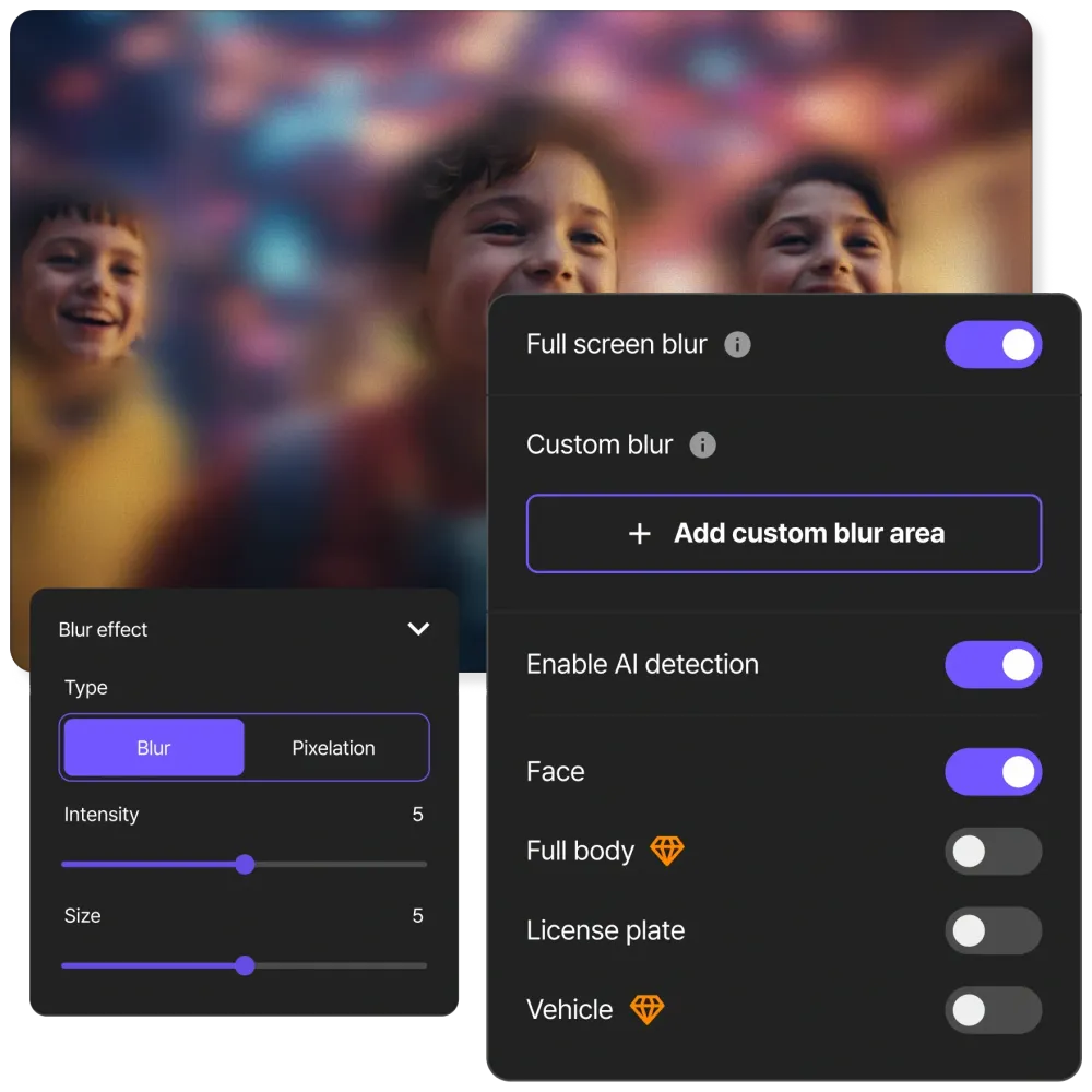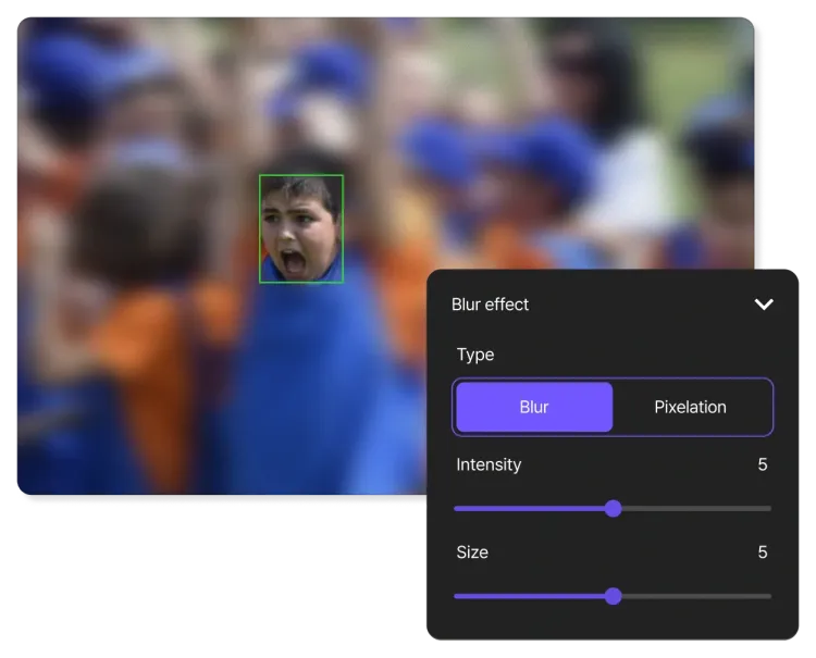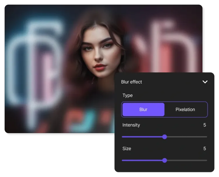 以可自訂的模糊設定,全面掌控照片背景。調整模糊大小與強度,並將風格設置為模糊馬賽克或像素化效果,幾秒鐘即可呈現專業效果。